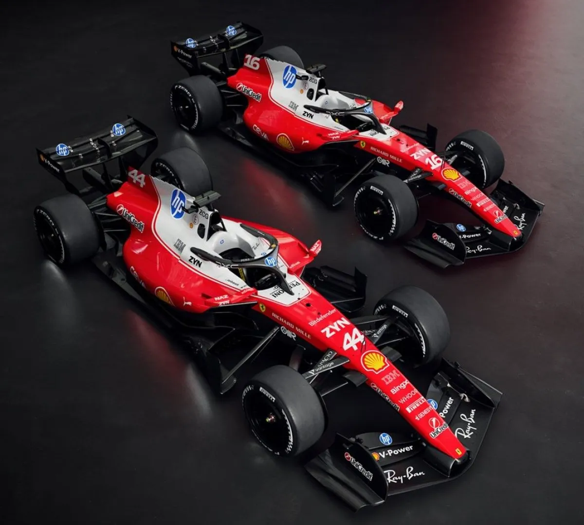 Los dos autos de Ferrari: el 44 de Lewis Hamilton y el 16 de Charles Leclerc.  Crédito Scuderia Ferrari