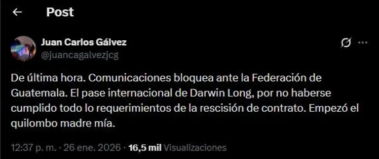 “De última hora, Comunicaciones bloquea ante la Federación de Guatemala el pase internacional de Darwin Lom, por no haberse cumplido todos los requerimientos de la rescisión de contrato”, compartió el periodista Juan Carlos Gálvez en su cuenta oficial de X.