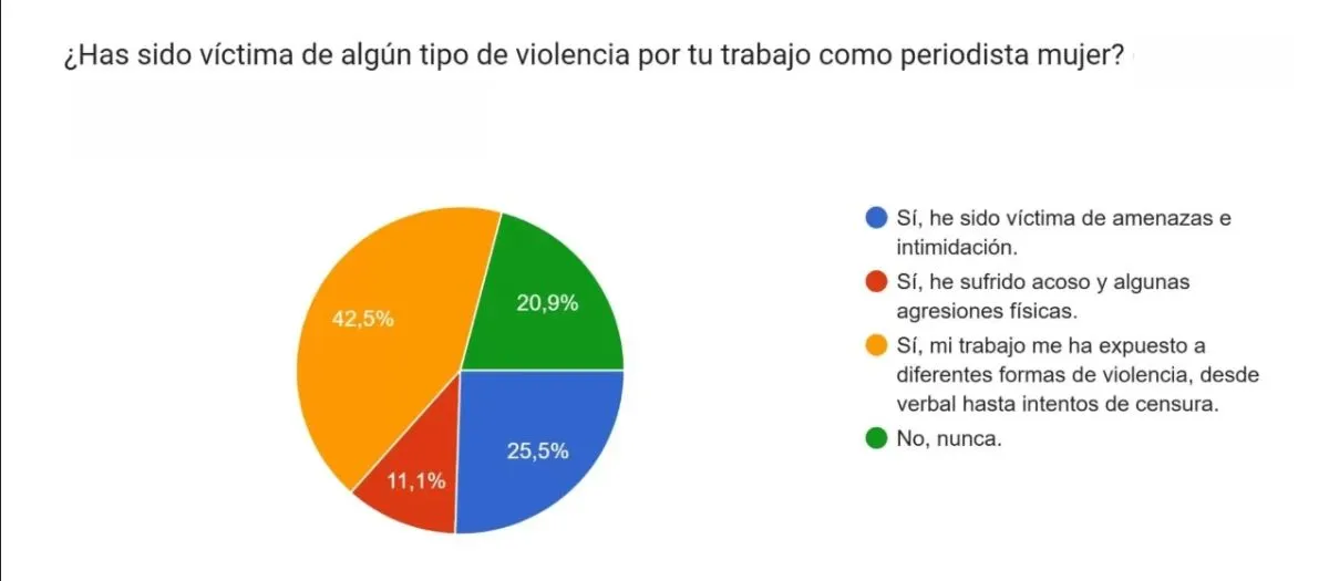 De acuerdo con el sondeo digital, el 79,1% de las participantes indicó haber sido víctima de algún tipo de violencia relacionada con su labor como periodista, mientras que el 20,9% señaló no haber pasado por estas situaciones.