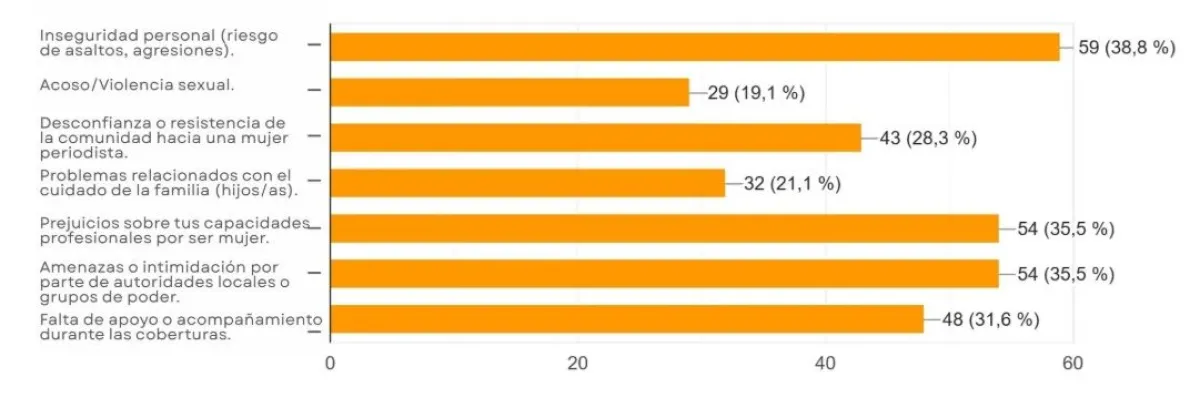 Al momento de realizar coberturas periodísticas, las encuestadas identificaron desafíos adicionales vinculados a su condición de mujeres. Entre los más mencionados se encuentran la inseguridad personal, como riesgos de asaltos y agresiones (38,8%); prejuicios sobre sus capacidades profesionales por ser mujer (35,5%), y amenazas o intimidación por parte autoridades locales o grupos de poder (35,5%).