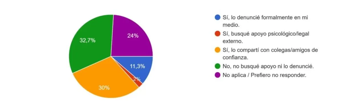 Pese a la recurrencia de situaciones de violencia y acoso, la mayoría de los casos no se denuncia; solo el 2% de las trabajadoras buscó apoyo legal. El 32,7% de las mujeres que atravesaron estas situaciones señaló que no buscó apoyo ni presentó una denuncia formal, un 30% solo compartió su caso con personas de su confianza y el 11,3% lo denunció formalmente en su medio.