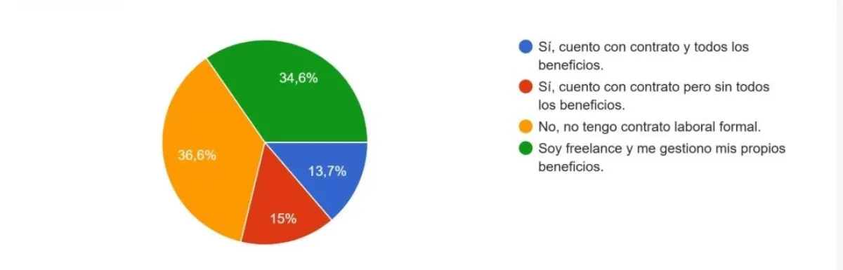Los datos también reflejan brechas en las condiciones laborales. Solo el 13,7 respondió que cuenta con contrato laboral que incluye todos los beneficios. Por el contrario, el 36,6% de las encuestadas trabaja sin contrato formal y el 34,6% lo hace bajo modalidad freelance o como colaboradora independiente que gestiona sus beneficios de manera particular. El 15% de las periodistas y comunicadoras cuenta con un contrato, pero sin beneficios.
