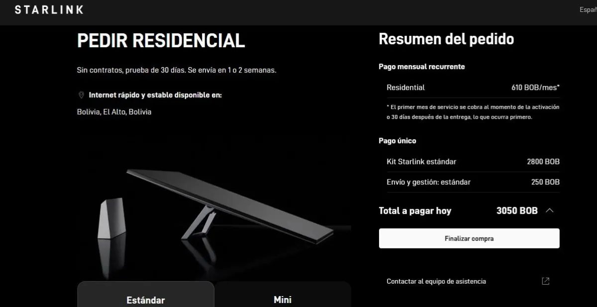 En el caso del internet residencial, el costo de la mensualidad es de 610 bolivianos; a esto se suma el kit Starlink estándar de Bs 2.800 y el envío de Bs 250, haciendo un total de Bs 3.050.