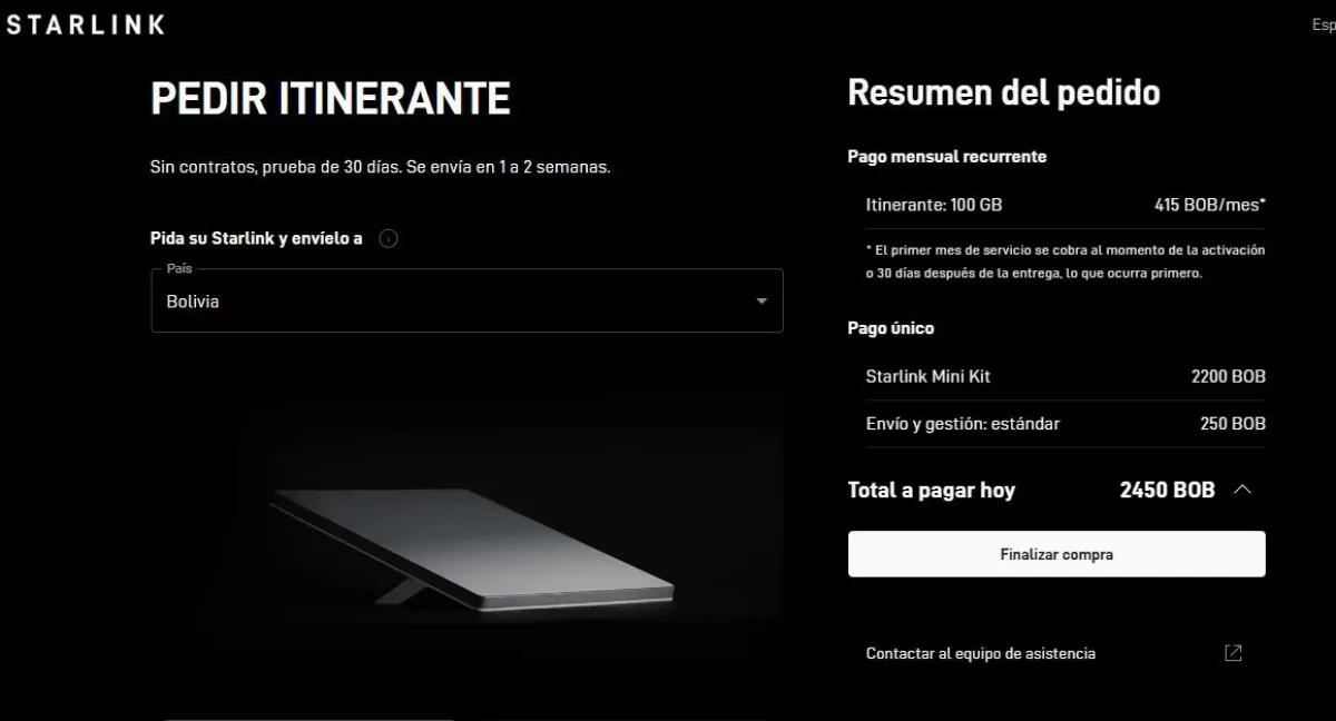 De acuerdo con la página de Starlink, el costo del internet itinerante, con una velocidad de 100 GB, es de 425 bolivianos al mes. A esto se suma el kit Starlink estándar, que vale Bs 2.800 (pago único), y el envío, que tiene un costo de Bs 250, haciendo un total de Bs 3.050. En el caso del mini kit (solo para aplicaciones básicas de internet), cuesta Bs 2.200; la mensualidad y el envío se mantienen.