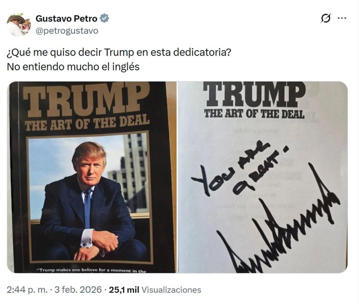 "¿Qué me quiso decir Trump en esta dedicatoria? No entiendo mucho el inglés", señaló Petro en el mensaje que acompaña la segunda foto.