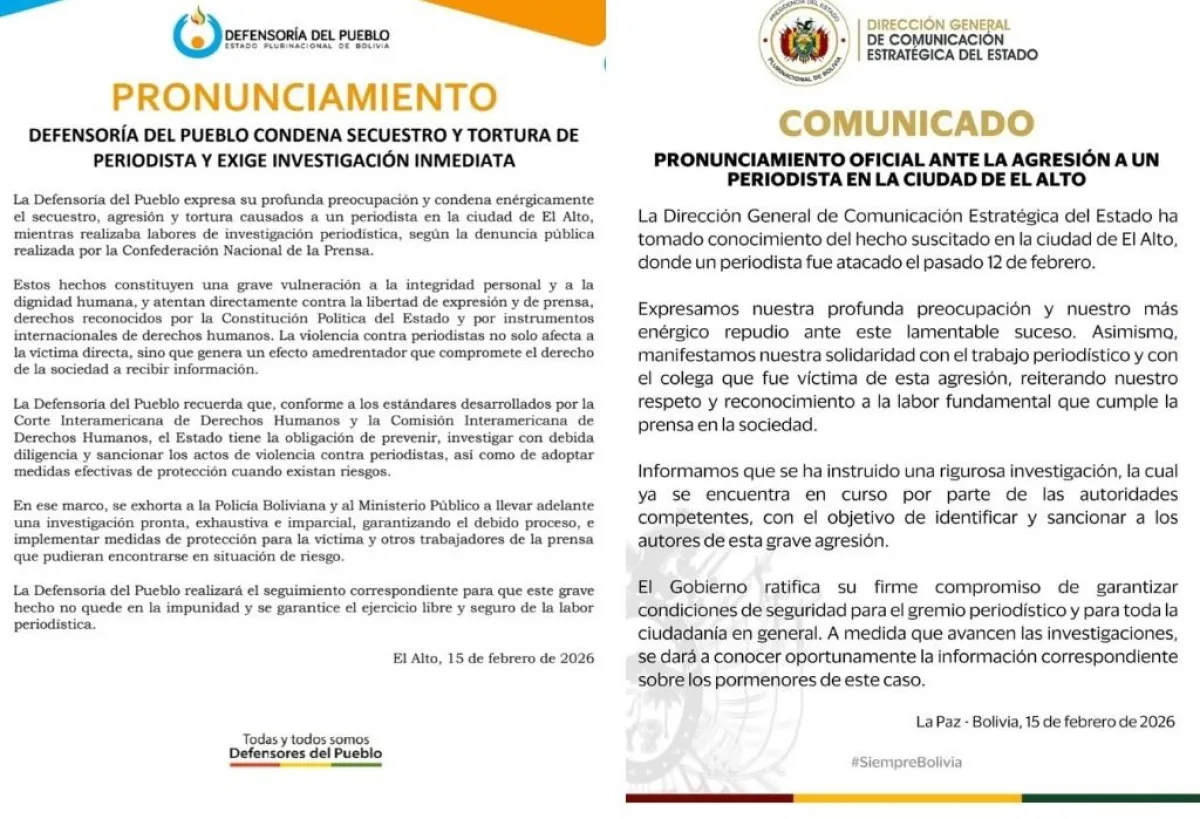 Por su lado, la Defensoría también expresó “su profunda preocupación y condena enérgicamente el secuestro, agresión y tortura causados a un periodista en la ciudad de El Alto”.