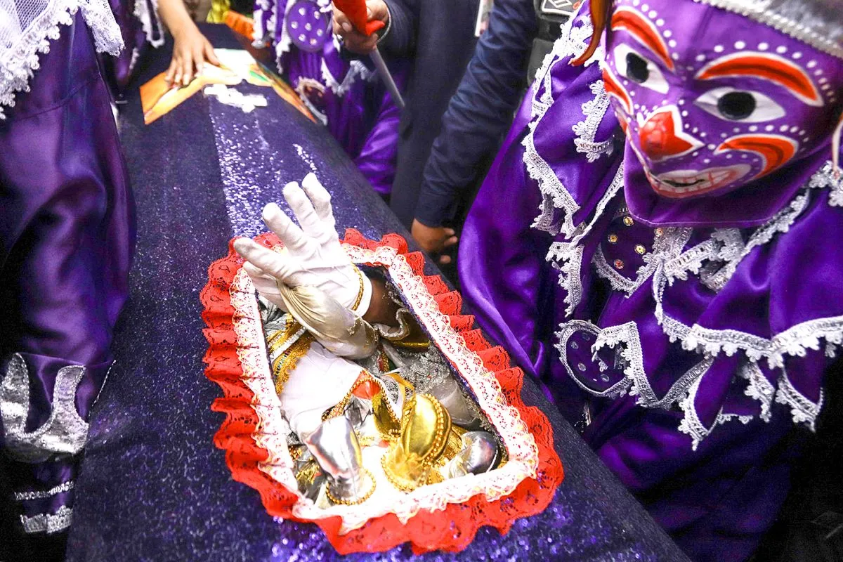 El recorrido tuvo matices de fiesta y sepelio, ya que el Pepino atravesó las calles con su típico traje bicolor ensanchado con volados y su tradicional máscara, que dibuja una amplia sonrisa y una nariz respingada, entre brincos y algarabía.