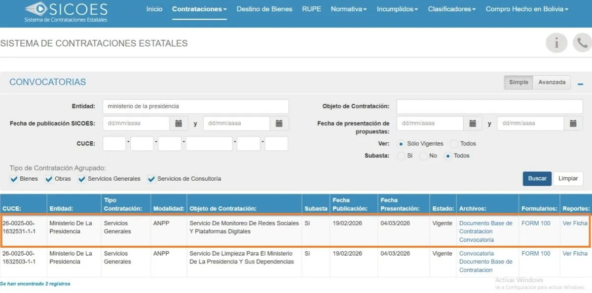 Sin embargo, aseguró que el “proceso de contratación mencionado ya no se encuentra vigente”, después de que el área de Comunicación Social del Gobierno dejara de depender del Ministerio de la Presidencia y pasara a la Presidencia. Empero, hasta la mañana de este martes, continuaba vigente la convocatoria en el Sistema de Contrataciones Estatales (Sicoes).