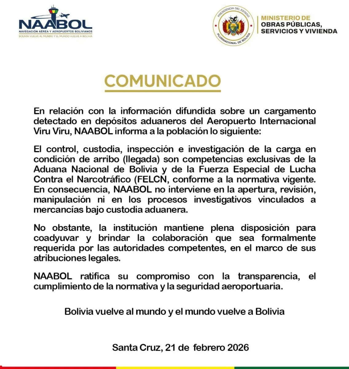 “El control, custodia, inspección e investigación de la carga en condición de arribo (llegada) son competencias exclusivas de la Aduana Nacional de Bolivia y de la Fuerza Especial de Lucha Contra el Narcotráfico (FELCN) conforme a la normativa vigente. En consecuencia, NAABOL no interviene en la apertura, revisión, manipulación ni en los procesos investigativos vinculados a mercancías bajo custodia aduanera”, señala el comunicado.