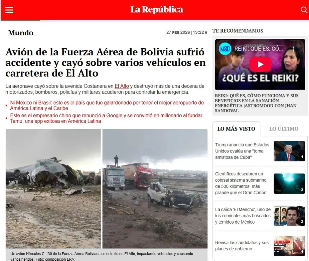 El sitio web de La República de Perú destaca en su portada: “Avión de la Fuerza Aérea de Bolivia sufrió accidente y cayó sobre varios vehículos en carretera de El Alto”, como su titular principal.