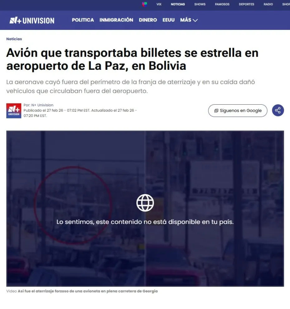 Univisión reporta: “Avión que transportaba billetes se estrella en aeropuerto de La Paz, en Bolivia”, y añade que “la aeronave cayó fuera del perímetro de la franja de aterrizaje y, en su caída, dañó vehículos que circulaban fuera del aeropuerto”.