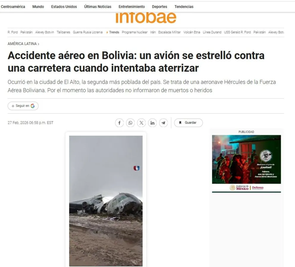 El portal de noticias Infobae también destaca en su portada el accidente aéreo: “Accidente aéreo en Bolivia: un avión se estrelló contra una carretera cuando intentaba aterrizar”.