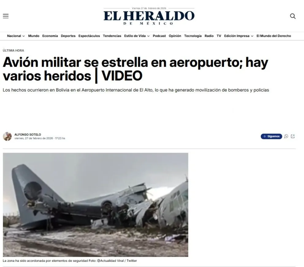 La noticia llegó hasta México, donde El Heraldo reportó: “Avión militar se estrella en aeropuerto; hay varios heridos”, y agregó: “Los hechos ocurrieron en Bolivia, en el Aeropuerto Internacional de El Alto, lo que ha generado la movilización de bomberos y policías”.