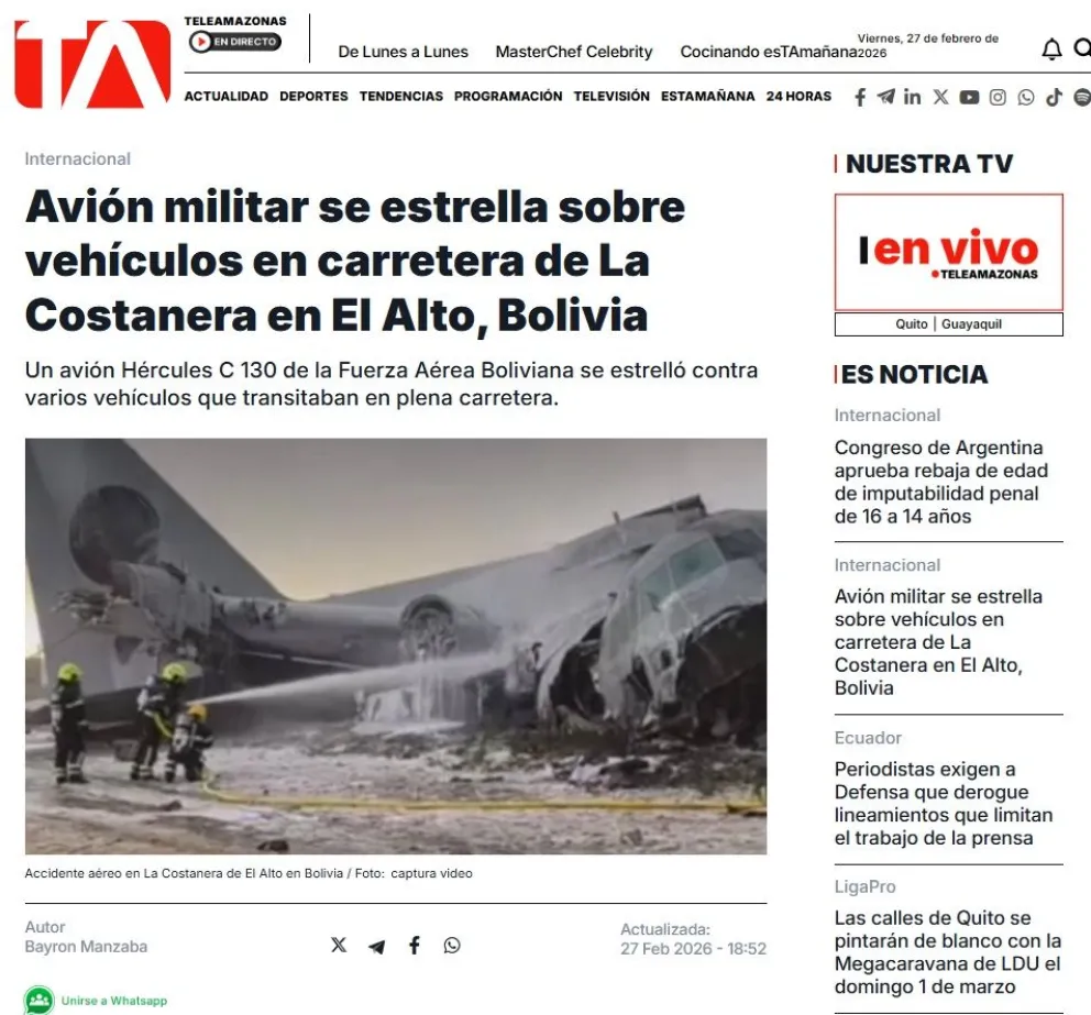Teleamazonas, a través de su portal digital, indicó: “Avión militar se estrella sobre vehículos en carretera de La Costanera en El Alto, Bolivia”. Posteriormente, añadió como complemento: “Un avión Hércules C130 de la Fuerza Aérea Boliviana se estrelló contra varios vehículos que transitaban en plena carretera”.