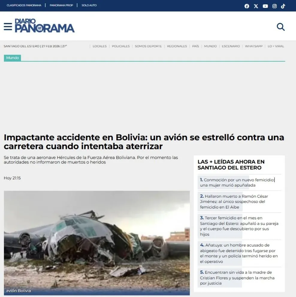 El diario Panorama también reportó: “Impactante accidente en Bolivia: un avión se estrelló contra una carretera cuando intentaba aterrizar”.