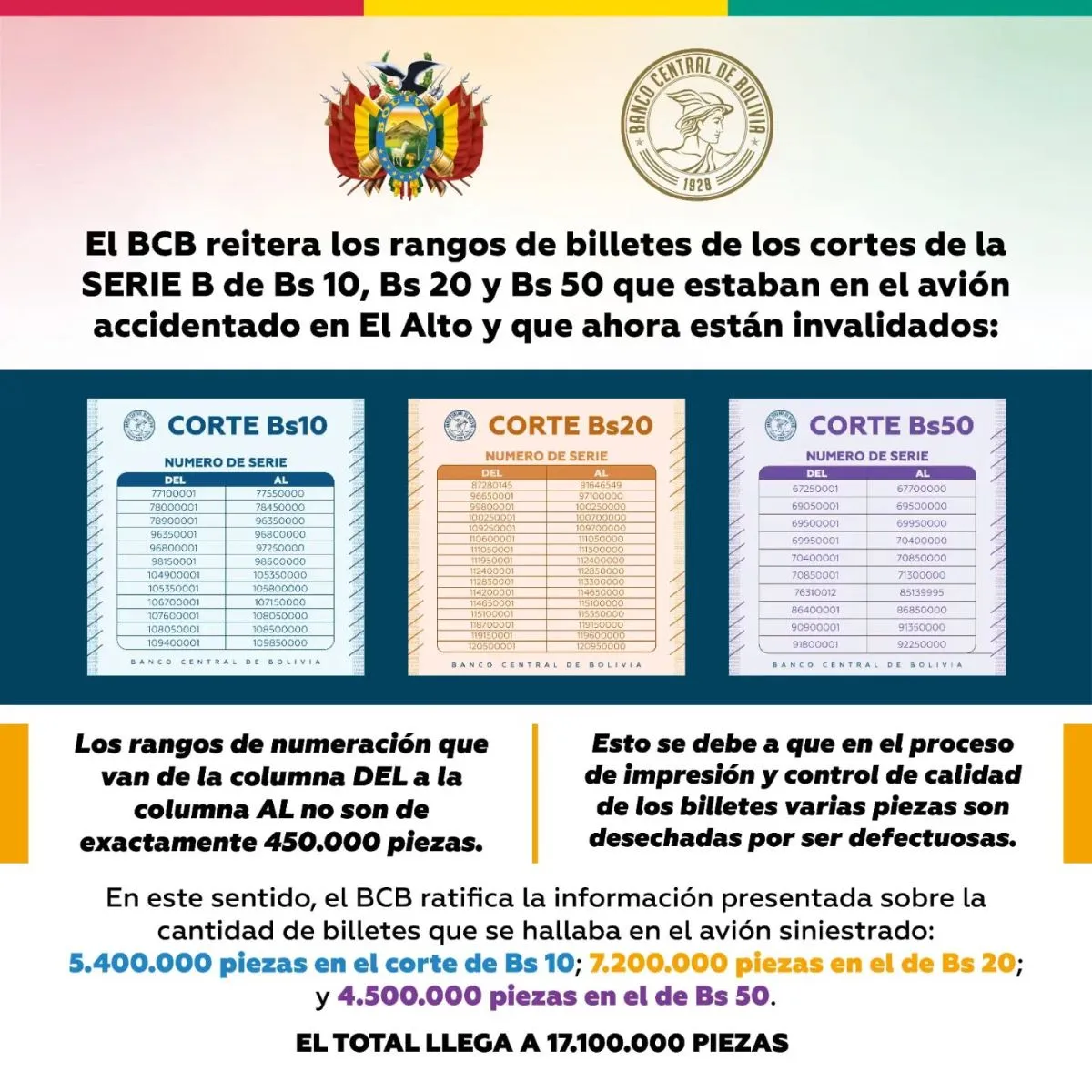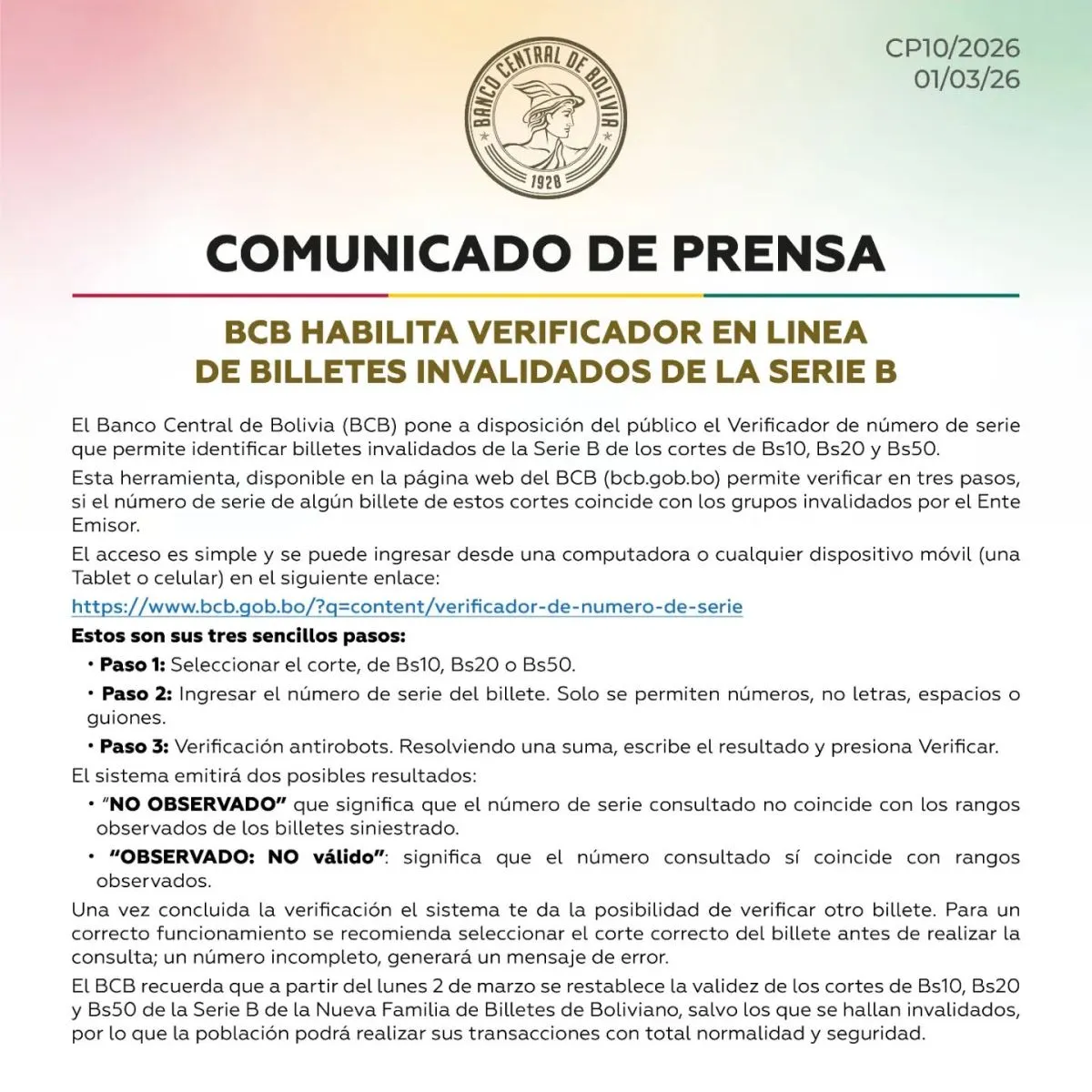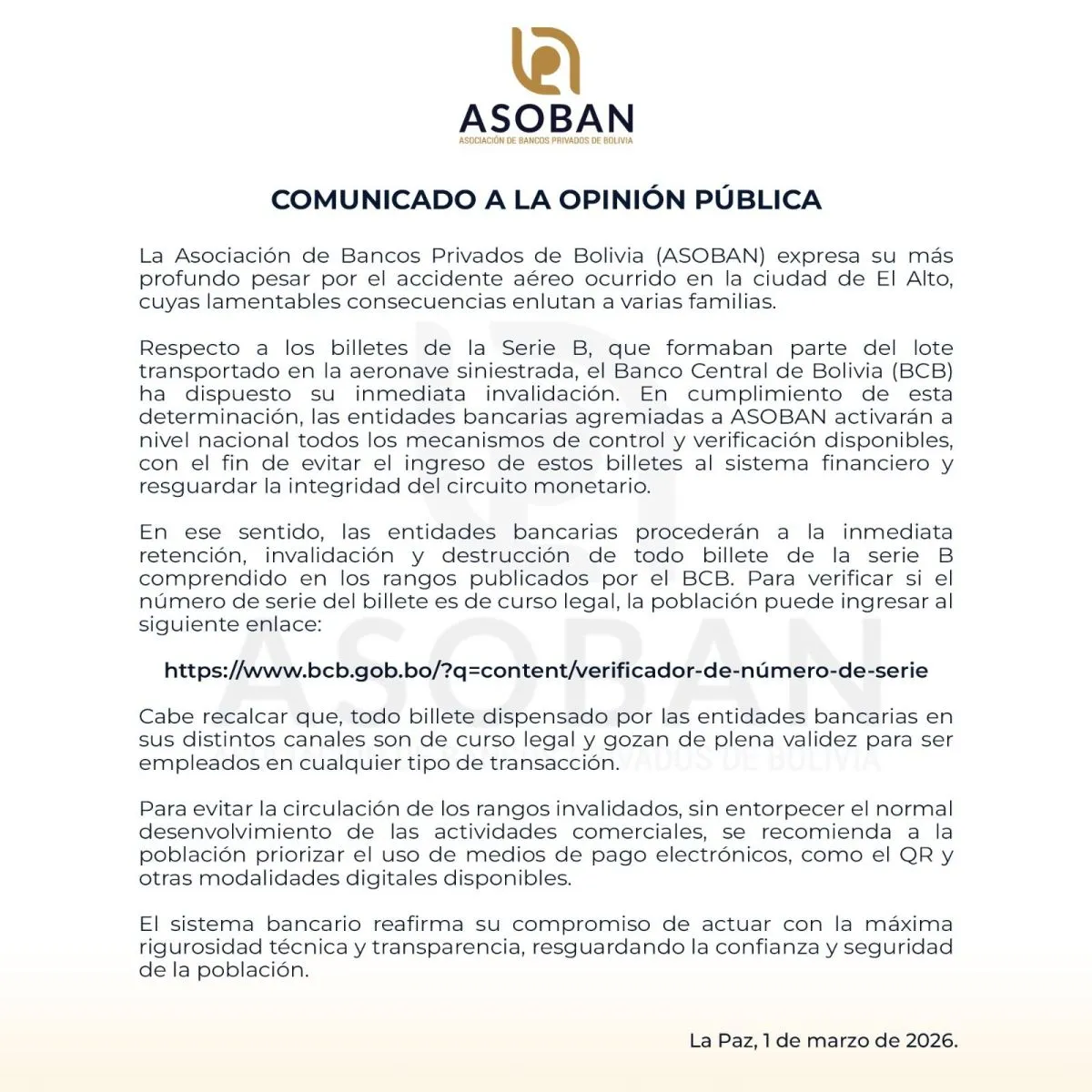 El sábado, el BCB informó que, a partir del lunes 2 de marzo, se restablecerá la plena validez legal de los billetes de Bs 10, Bs 20 y Bs 50 correspondientes a la Serie B, luego de la suspensión temporal dispuesta como medida preventiva tras el accidente aéreo ocurrido el viernes 27 de febrero. Además, la entidad bancaria difundió la lista de los números de serie de la moneda nacional sustraída e inhabilitada para su circulación.