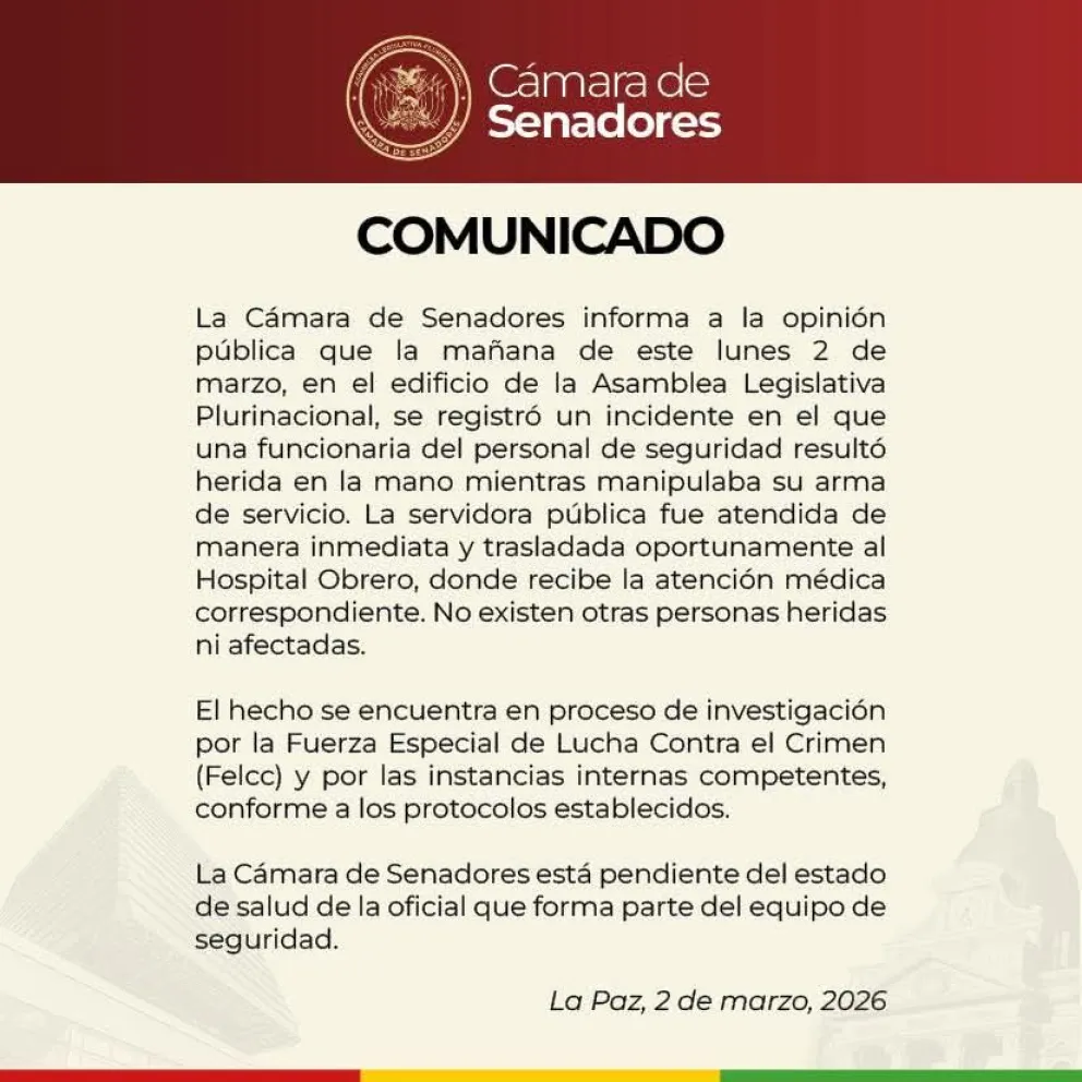 “Se registró un incidente en el que una funcionaria del personal de seguridad resultó herida en la mano mientras manipulaba su arma de servicio. La servidora pública fue atendida de manera inmediata y trasladada oportunamente al Hospital Obrero, donde recibe la atención médica correspondiente”, señala un comunicado del Senado.