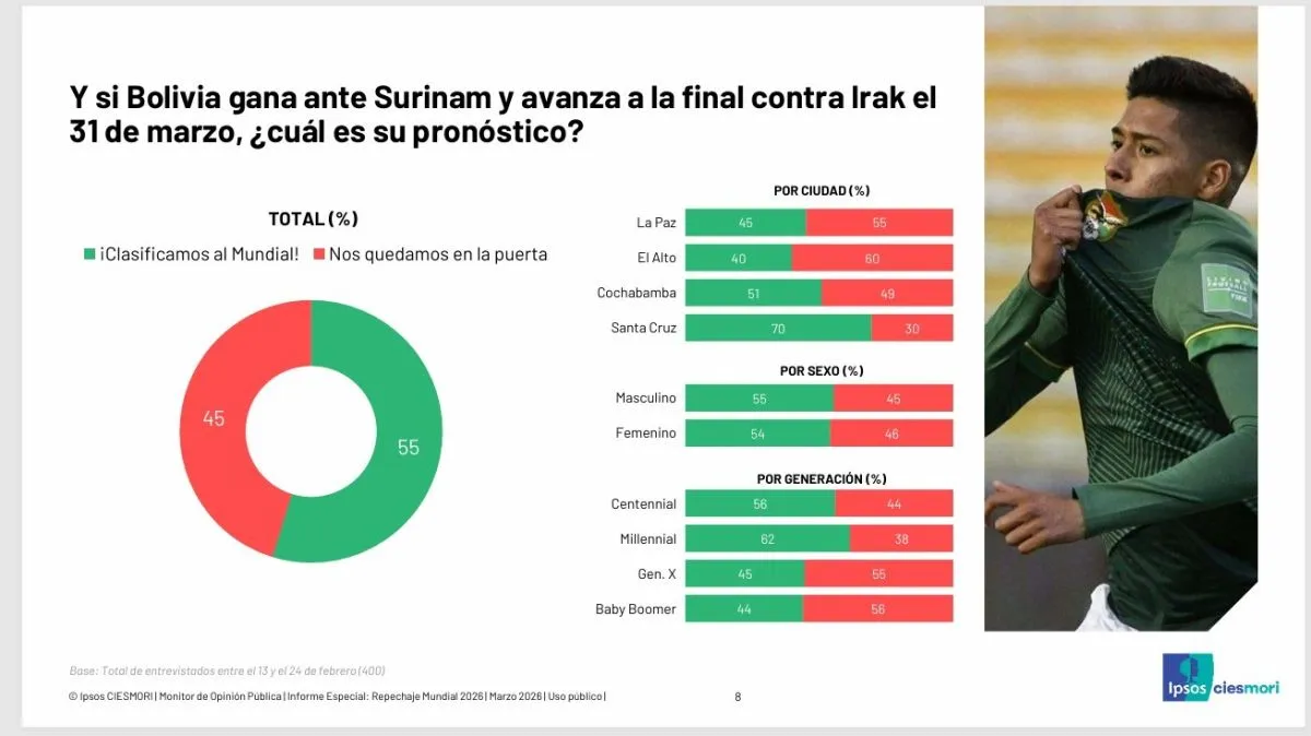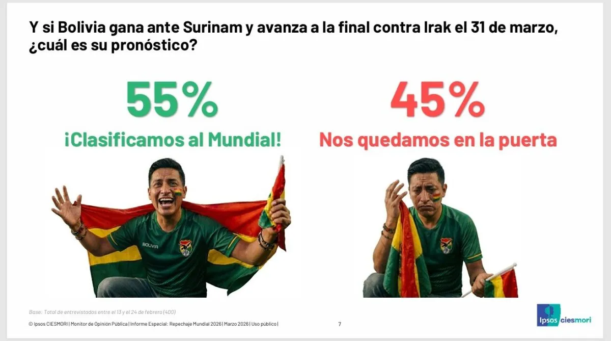 Según los datos de la empresa, un 55% de los encuestados opina que, si la Verde supera su primer partido, la clasificación es posible. La pregunta puntual fue: “Y si Bolivia gana ante Surinam y avanza a la final contra Irak el 31 de marzo, ¿cuál es su pronóstico?”