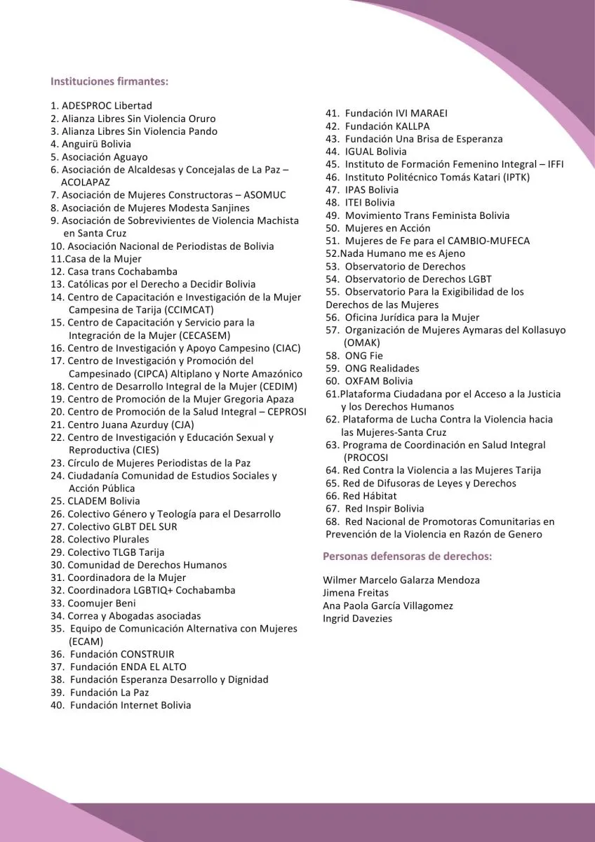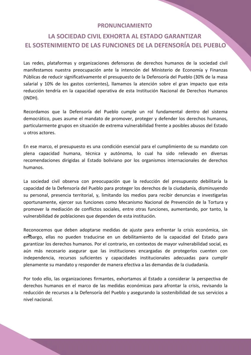 Un comunicado público de más de 60 organizaciones informa que el MEFP pretende “reducir significativamente el presupuesto de la Defensoría del Pueblo (30 % de la masa salarial y 10 % de los gastos corrientes)”.