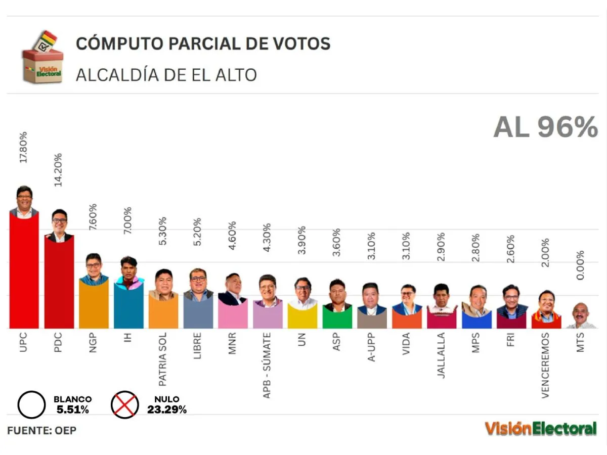 Al 97% de las actas computadas en el Sistema de Resultados Preliminares (Sirepre), el candidato por Unidad Por el Cambio (UPC), Eliser Roca, toma ventaja con el 17,8% de la votación en la ciudad de El Alto, pero de cerca le sigue Gabriel Mamani, del Partido Demócrata Cristiano (PDC), con el 14,2%.