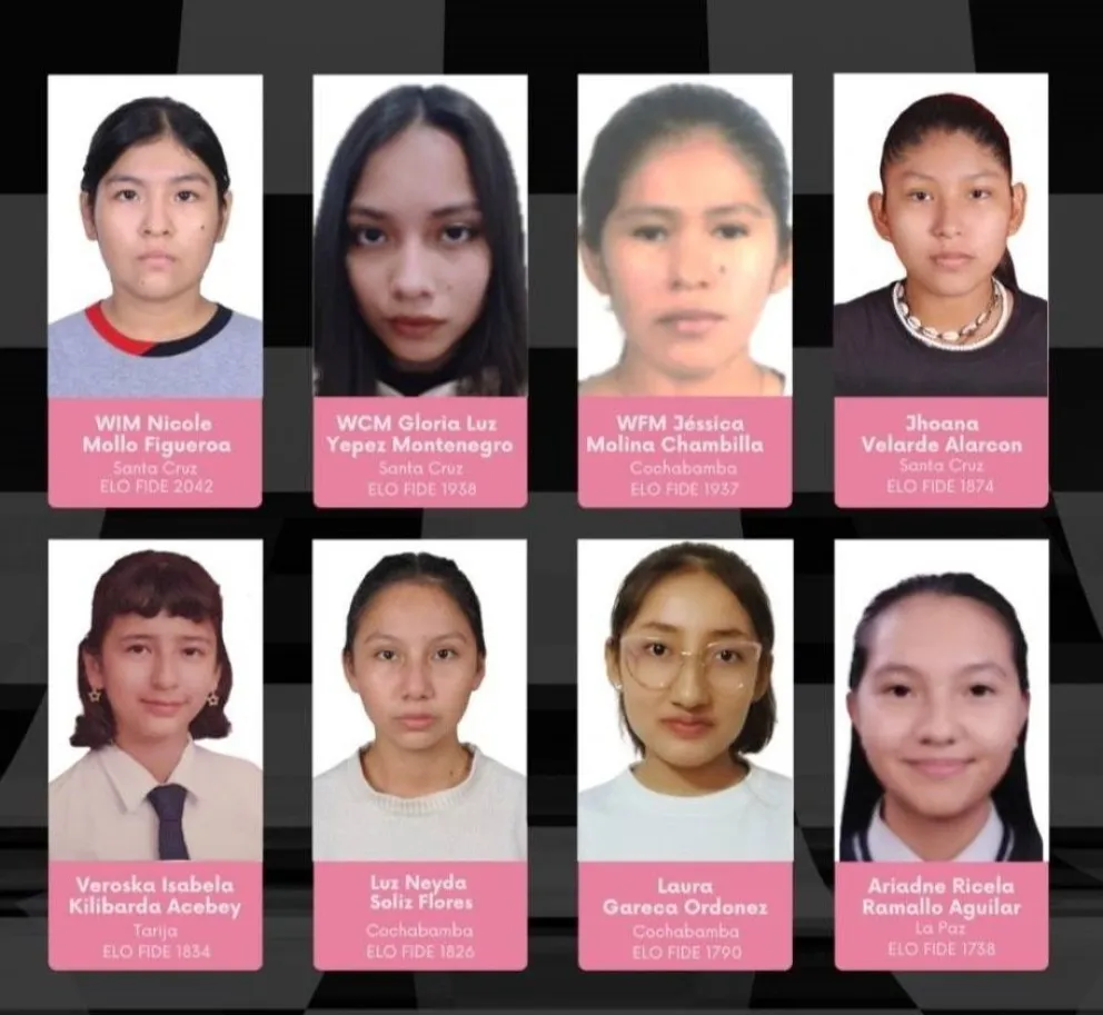 Por el lado femenino competirán: la Maestra Internacional (WIM por sus siglas en inglés) Nicole Mollo (Santa Cruz), la Candidata a Maestra (WCM) Gloria Yépez (Santa Cruz), la Maestra Fide (WFM) Jessica Molina (Cochabamba), Jhoana Velarde (Santa Cruz), Isabela Kilibarda (Tarija), Luz Soliz y Laura Gareca (las dos de Cochabamba), además de Ariadne Ramallo (La Paz).