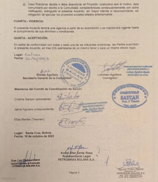 “La comunidad manifiesta su conformidad para que Petrobras, a partir del 1 de noviembre de 2023 pueda ingresar a efectuar los trabajos de relevamiento de datos citados en la cláusula 2.1 anterior, para la obtención de la respectiva Licencia Ambiental, Plan de Desmonte y elaboración de Ingeniería Básica del Proyecto, así como otros estudios relacionados”, señala textual el documento.