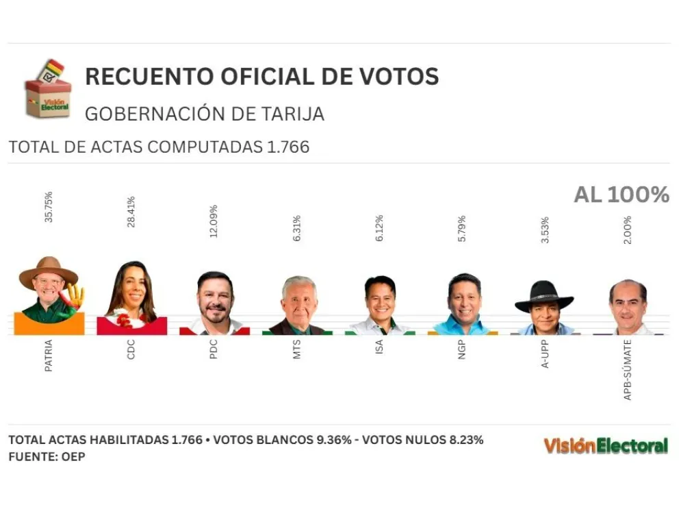 Lee también: Tarija cierra cómputo oficial y van a segunda vuelta por la Gobernación Oliva y Soruco