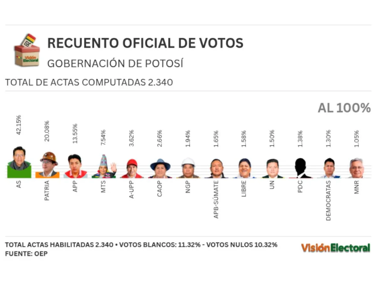 Según el informe del OEP, el total de las actas habilitadas fue de 2.340 y el total de actas computadas fue de 2.340; 481.457 ciudadanos potosinos fueron habilitados para emitir su voto; los votos emitidos fueron 419.160; los votos válidos fueron 328.443 (78,36 %); 47.443 votos fueron blancos (11 %) y 43.274 (10,32 %) fueron nulos.