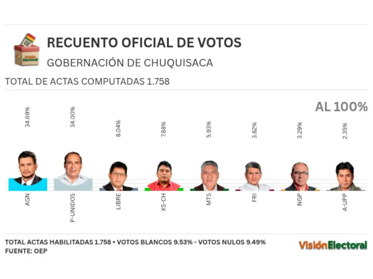 Chuquisaca irá el 19 de abril a una segunda vuelta para elegir a su nuevo gobernador entre los candidatos Luis Ayllón, de la Alianza Gente Nueva (AGN), y Franz García, de la Alianza Patria Unidos, según el conteo oficial del Tribunal Electoral Departamental (TED).