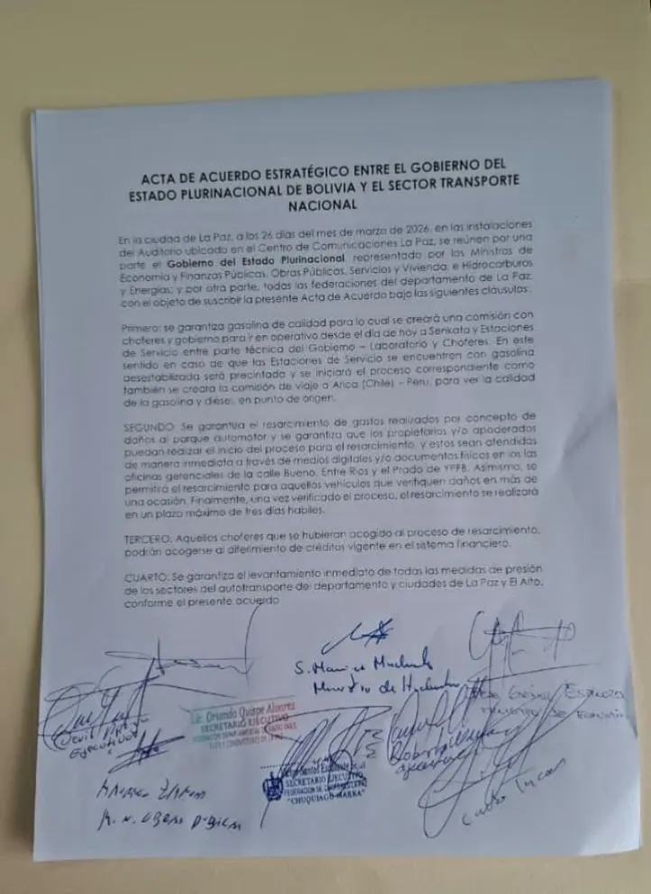 Después de llevar adelante una reunión con representantes del Gobierno, los choferes de La Paz determinaron levantar el paro indefinido que llevaban adelante en rechazo a los daños que causa en sus motorizados la cagolina de mala calidad. Los conductores firmaron un acuerdo con los ministros de Presidencia, Obras Públicas, Gobierno, Economía e Hidrocarburos.