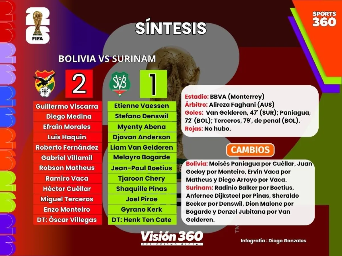 De la mano de Moisés Paniagua y Miguel Terceros, Bolivia dio vuelta el marcador y venció a Surinam (2-1), este jueves por la noche en el estadio BBVA de Monterrey, México, y avanzó a la final del repechaje, con lo que está a una victoria más de clasificarse a la Copa del Mundo de 2026.