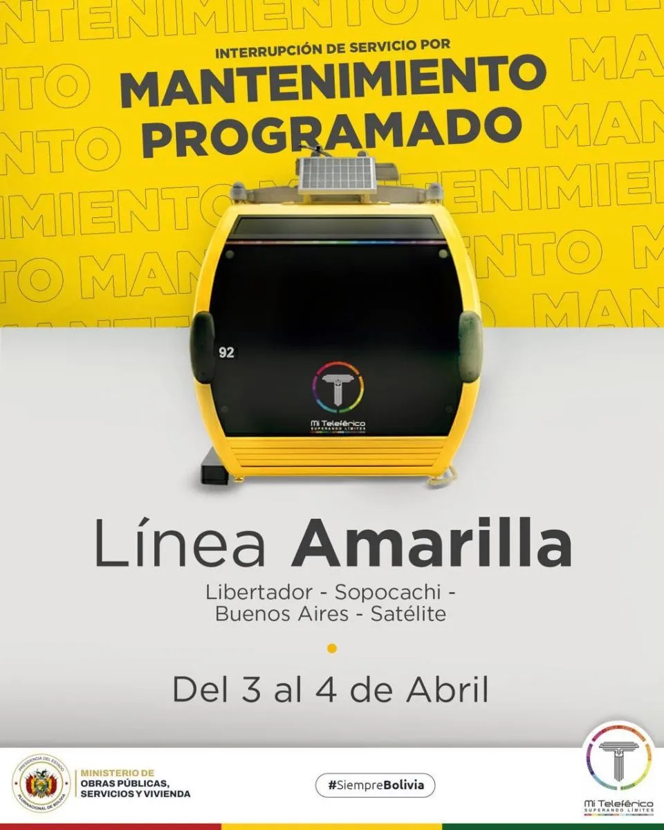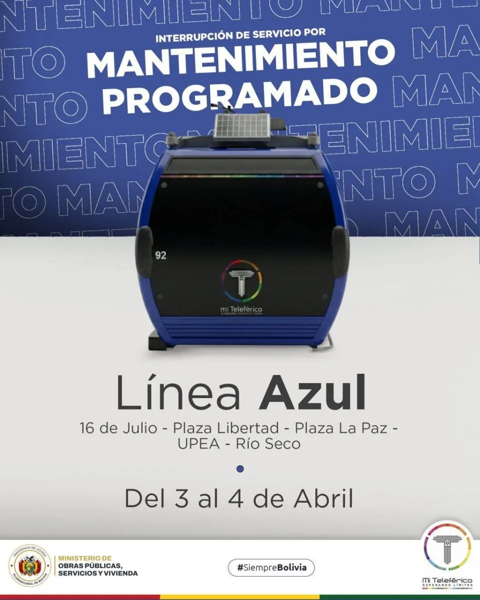 La empresa estatal Mi Teleférico informó que las líneas Amarilla y Azul interrumpirán temporalmente sus operaciones los días viernes 3 y sábado 4 de abril, con el objetivo de ejecutar trabajos de mantenimiento programado orientados a reforzar la seguridad, confiabilidad y continuidad del servicio.