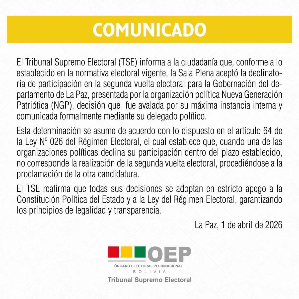 En medio de las críticas por aceptar la declinatoria de la candidatura de Nueva Generación Patriótica (NGP), el Tribunal Supremo Electoral (TSE) emitió un comunicado en el cual respalda su accionar y establece que aceptar la decisión del delegado político de dicha sigla, que postuló a René Yahuasi como candidato a la Gobernación de La Paz, estuvo en estricto apego a la normativa vigente.