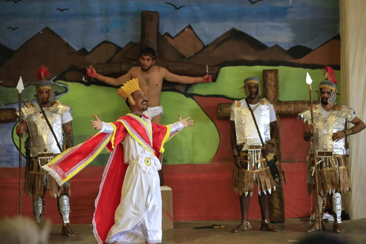 Hay escenarios que incluyen desde el huerto de Getsemaní, hasta el lugar donde fue crucificado o la cueva donde lo enterraron y resucitó. Entre el público, autoridades y decenas de prisioneros de camiseta amarilla escoltados por fuerzas de seguridad de negro, con material antidisturbios o armamento de alto calibre.