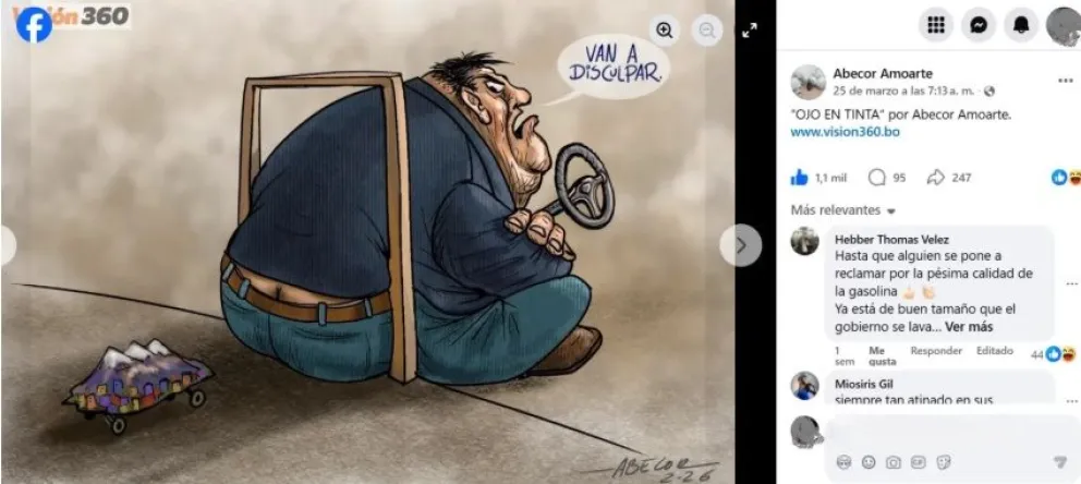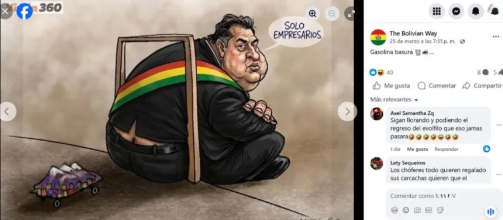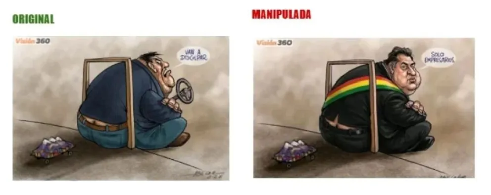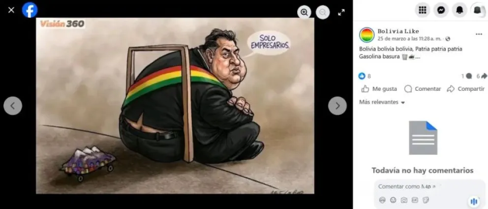 La última caricatura alterada que fue identificada -el 25 de marzo- es una que se refiere al paro de transporte en La Paz por los daños que generó el combustible en los vehículos. La imagen original fue manipulada y difundida en dos páginas de Facebook (1 y 2):
