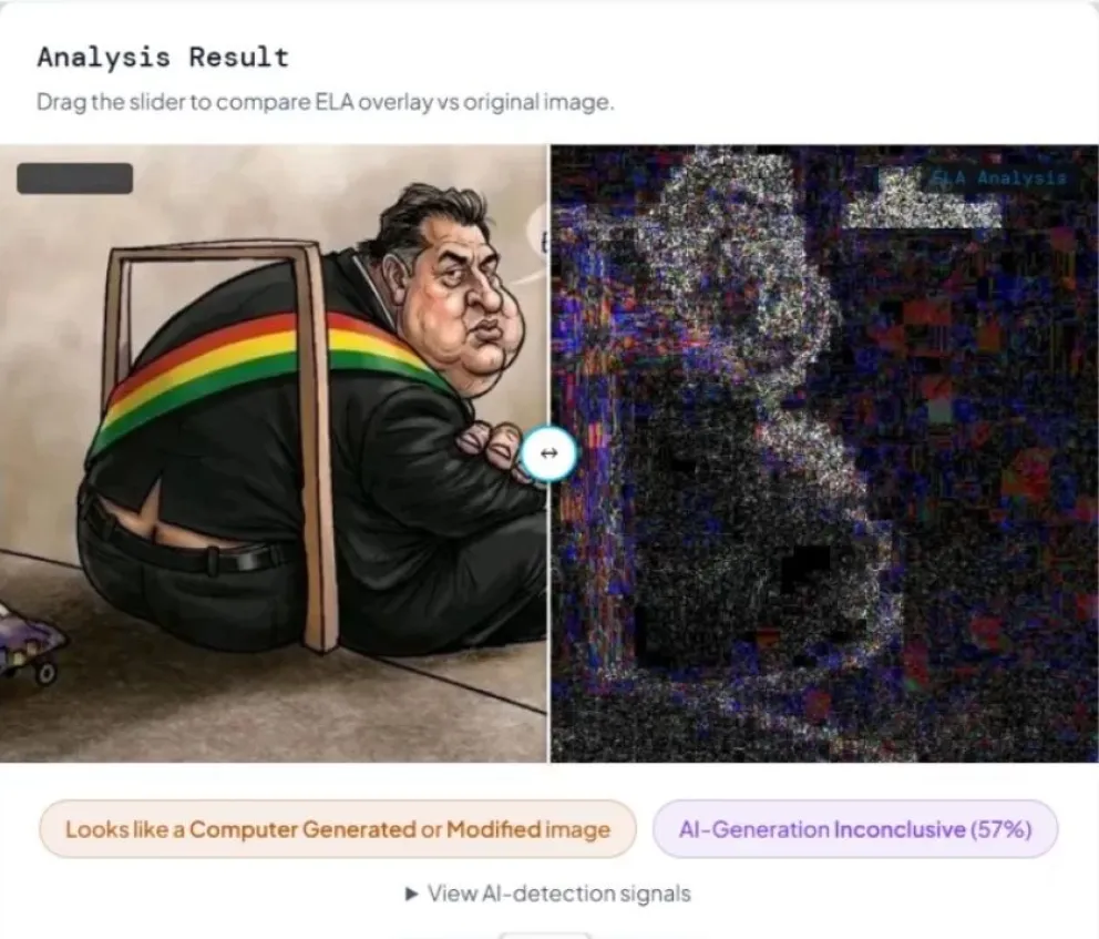 A partir de una comparación visual, se identificaron elementos añadidos y modificados respecto a la caricatura original. Bolivia Verifica utilizó herramientas de detección como Diffchecker Desktop y Fake Image Detector para la comparación de imágenes. Se identificó hasta un 57 % de alteración con inteligencia artificial en el material analizado.