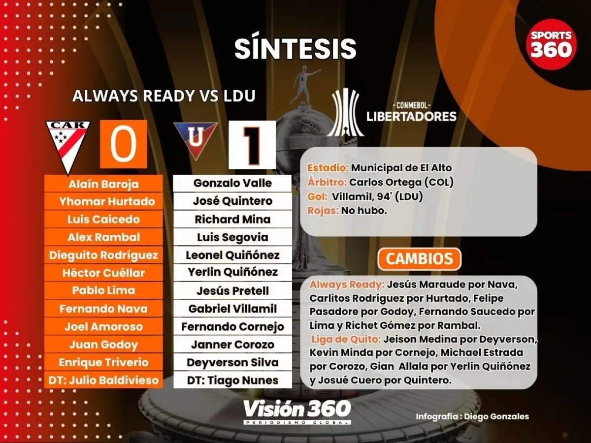 Con el tanto del boliviano Gabriel Villamil a los 94 minutos, la Liga de Quito rompió el invicto internacional de Always Ready al ganarle por 0-1, este martes por la noche en el estadio Municipal de El Alto por la primera jornada del Grupo G de la Copa Libertadores de América.