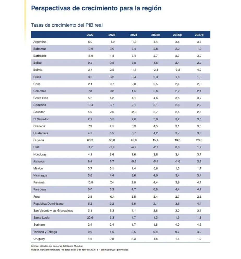 "América Latina y el Caribe (ALC) crecerá un 2,1% en 2026, por debajo del 2,4% registrado en 2025. El crecimiento para 2027 se proyecta en un 2,4%. Las perspectivas moderadas reflejan un entorno macroeconómico desafiante, en el que los elevados costos de endeudamiento, la débil demanda externa y las presiones inflacionarias derivadas de la incertidumbre geopolítica frenan la inversión privada y la creación de empleo", indica la última edición del Panorama Económico de América Latina y el Caribe.