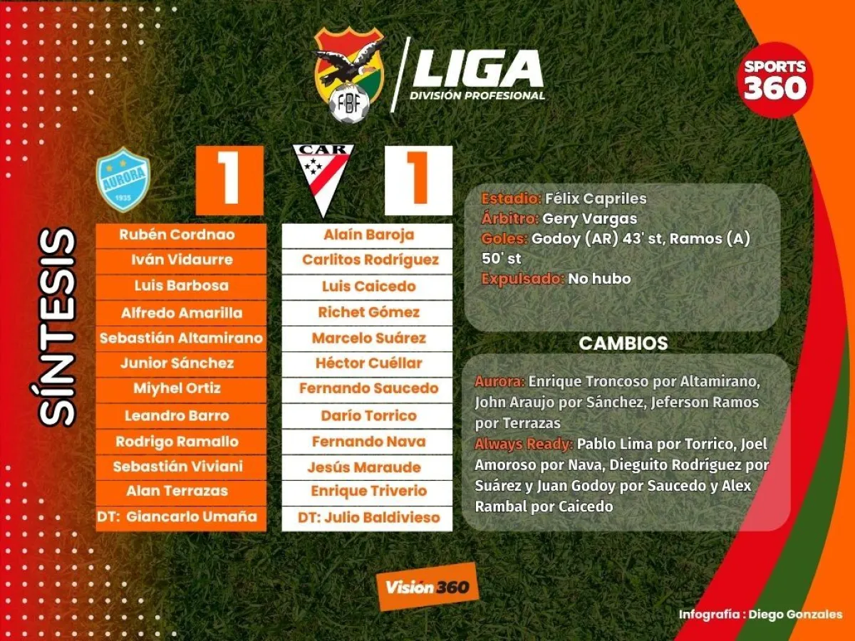 Un final vibrante tuvo el partido quer empataron Aurora y Always Ready a un gol por lado. Los millonarios saboreaban el triunfo, pero en el quinto minuto del tiempo adicionado llegó la igualdad en el juego que se desarrolló en el estadio Félix Capriles.