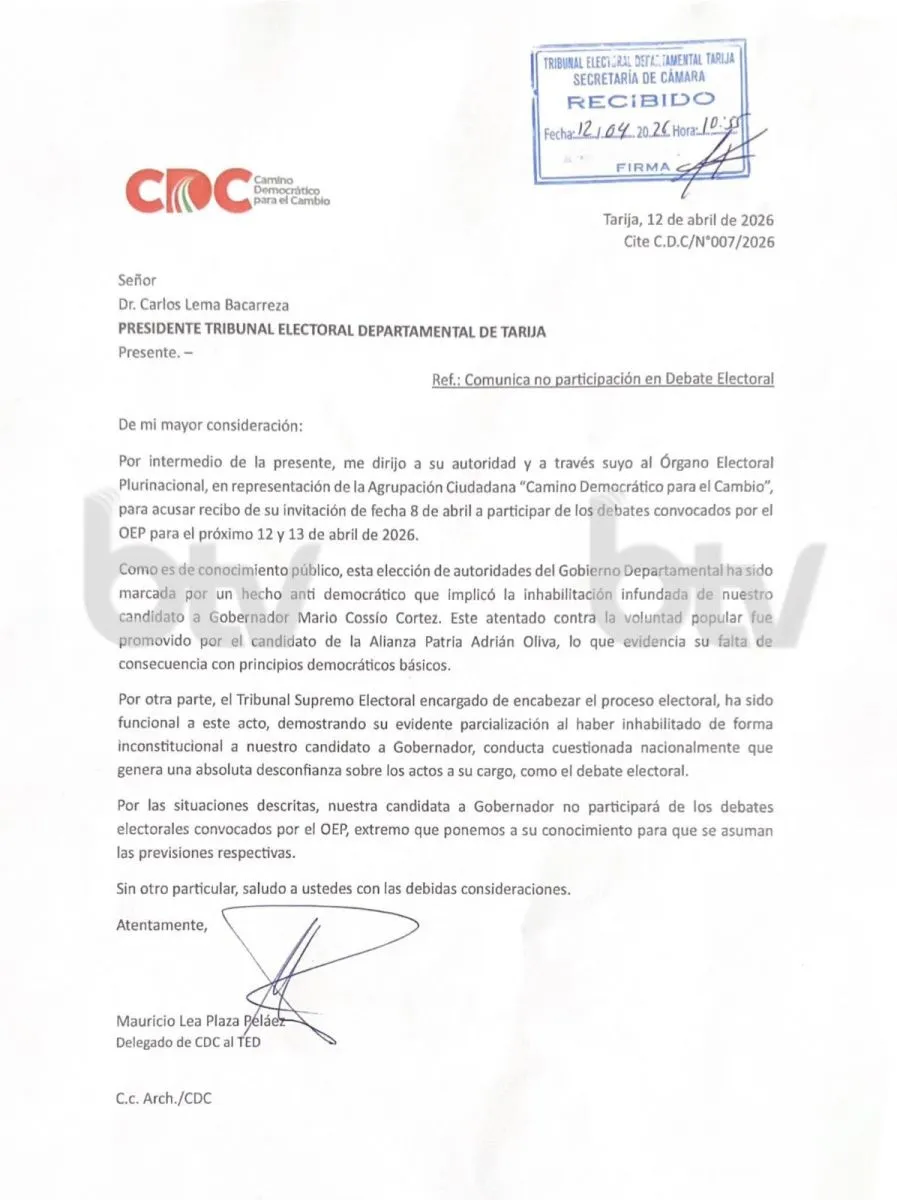 La misiva fue firmada por el delegado del CDC, Mauricio Lea Plaza al TED tarijeño.