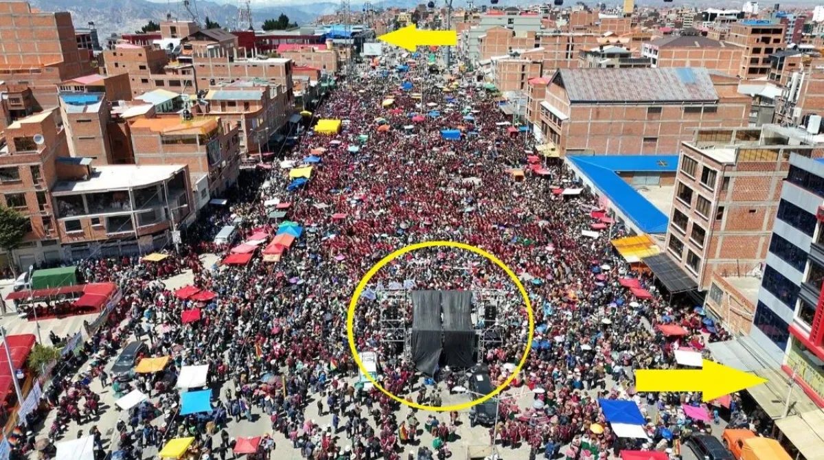 En este video, por ejemplo, Wara TV muestra con un dron la multitudinaria asistencia que hubo, pero aun así las personas no sobrepasan el colegio Antofagasta Noruego, que es otra de las referencias, ni las estaciones de Mi Teleférico.