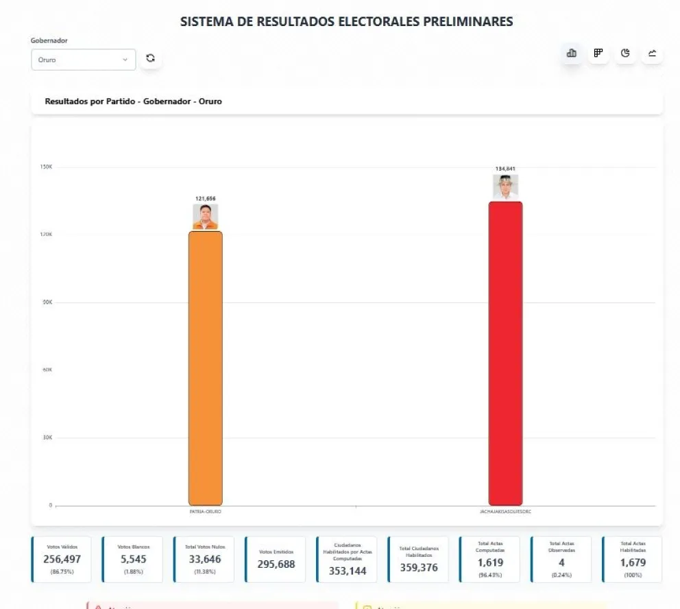De acuerdo a estos resultados, Sánchez obtuvo 134.841 votos, mientras que su rival en urnas, Óscan Chambi Callapa, de la Alianza Patria Oruro, logró 121.656 votos (47,43%)