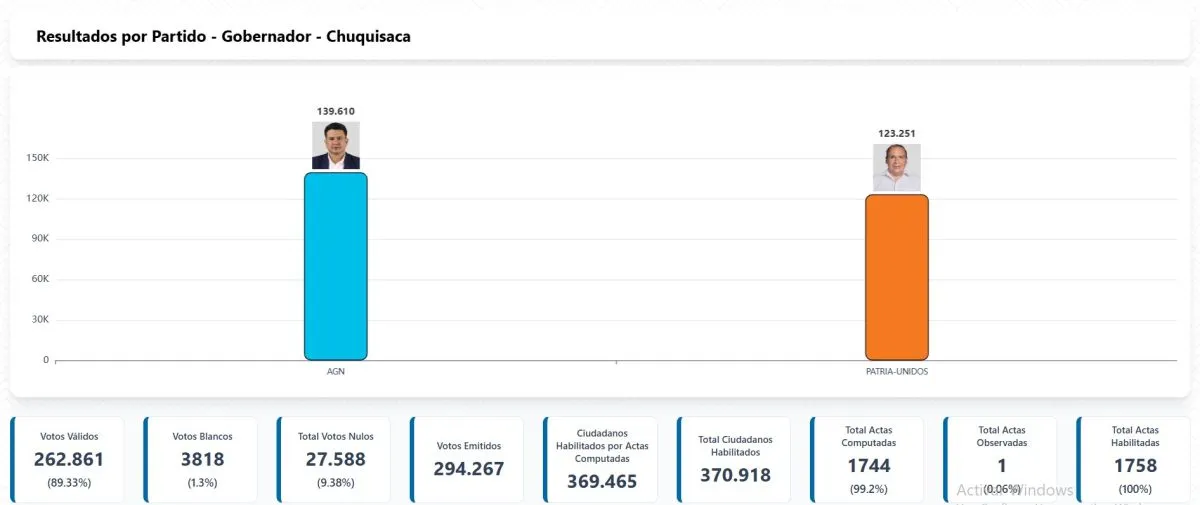 De acuerdo con los datos difundidos, Ayllón obtuvo el 53,11% de los votos (139.610), frente al 46,89% (123.251) alcanzado por su contrincante, Franz García, de la Alianza Patria Unida. Con este resultado, el candidato oficialista logra una ventaja suficiente para asegurar el triunfo en el balotaje departamental.