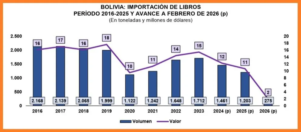 En 2023, el valor de las importaciones de libros se ubicó en 15 millones de dólares. En las gestiones siguientes se registraron descensos consecutivos. En 2024, la cifra llegó a 12 millones y, en 2025, esa cantidad bajó a 11 millones. En estos primeros meses de la presente gestión, las compras de libros del exterior llegaron a dos millones de dólares.