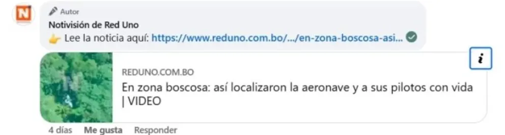 En las horas posteriores al accidente aéreo, medios de comunicación tradicionales y digitales como Red UnoUrgente.boBolivia TVLa RazónBolivisiónPeriodismo Somos TodosDetrás de la VerdadRPOSBolivia y otros portales difundieron que el piloto y copiloto de la aeronave que cayó en el trópico cochabambino habían sido encontrados con vida (ver medios: 9101112131415161718192021222324252627).