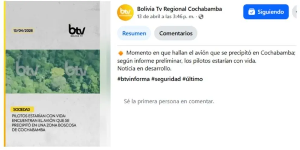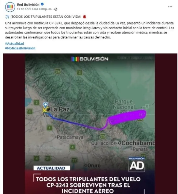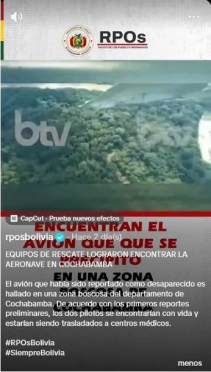 «El avión que había sido reportado como desaparecido es hallado en una zona boscosa del departamento de Cochabamba. De acuerdo con los primeros reportes preliminares, los dos pilotos se encontrarían con vida y estarían siendo trasladados a centros médicos».