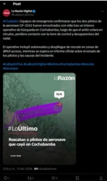 4. La Razón: «Equipos de emergencia confirmaron que los dos pilotos de la aeronave CP-3243 fueron encontrados con vida tras un intenso operativo de búsqueda en Cochabamba (…)»