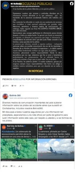 En otros casos, como los medios digitales IN Noticias y Bolivia 360, las publicaciones fueron eliminadas y se difundieron comunicados en los que pidieron disculpas a las familias de los fallecidos y a su audiencia por la difusión de información no verificada.
