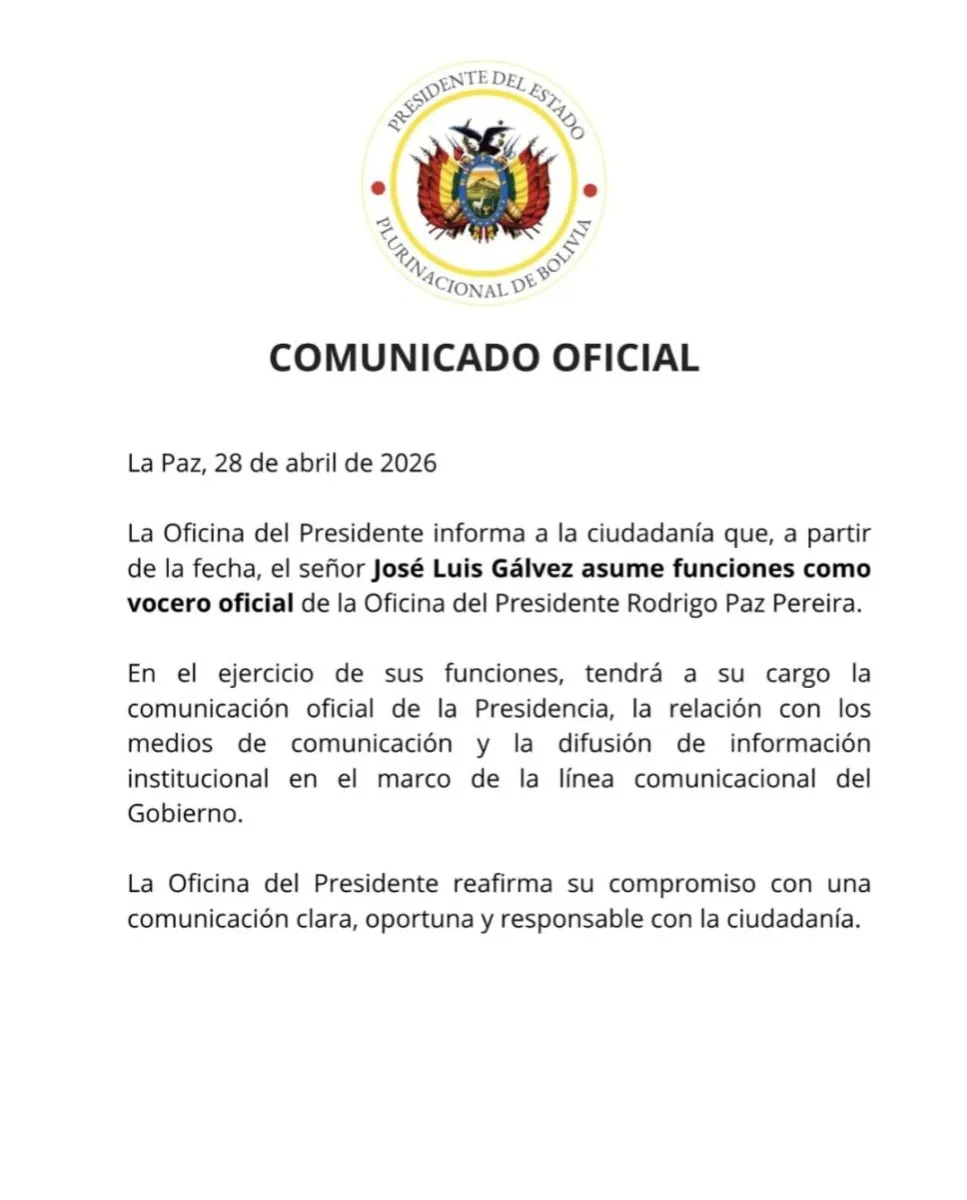 La Oficina del Presidente informó este martes la designación de José Luis Gálvez como nuevo vocero oficial del presidente Rodrigo Paz Pereira. El anuncio fue realizado a través de un comunicado de prensa.